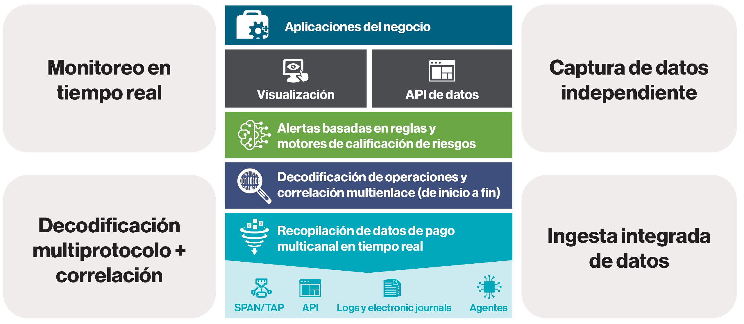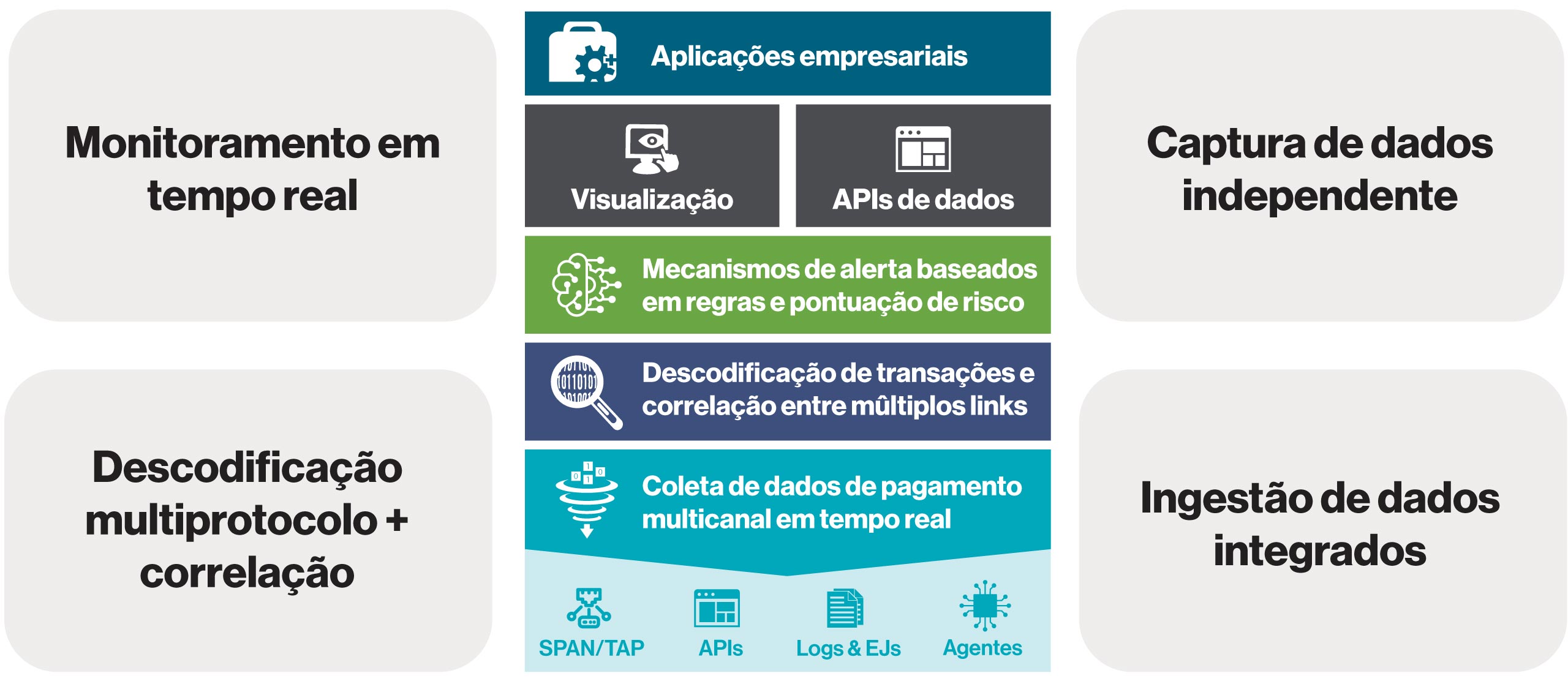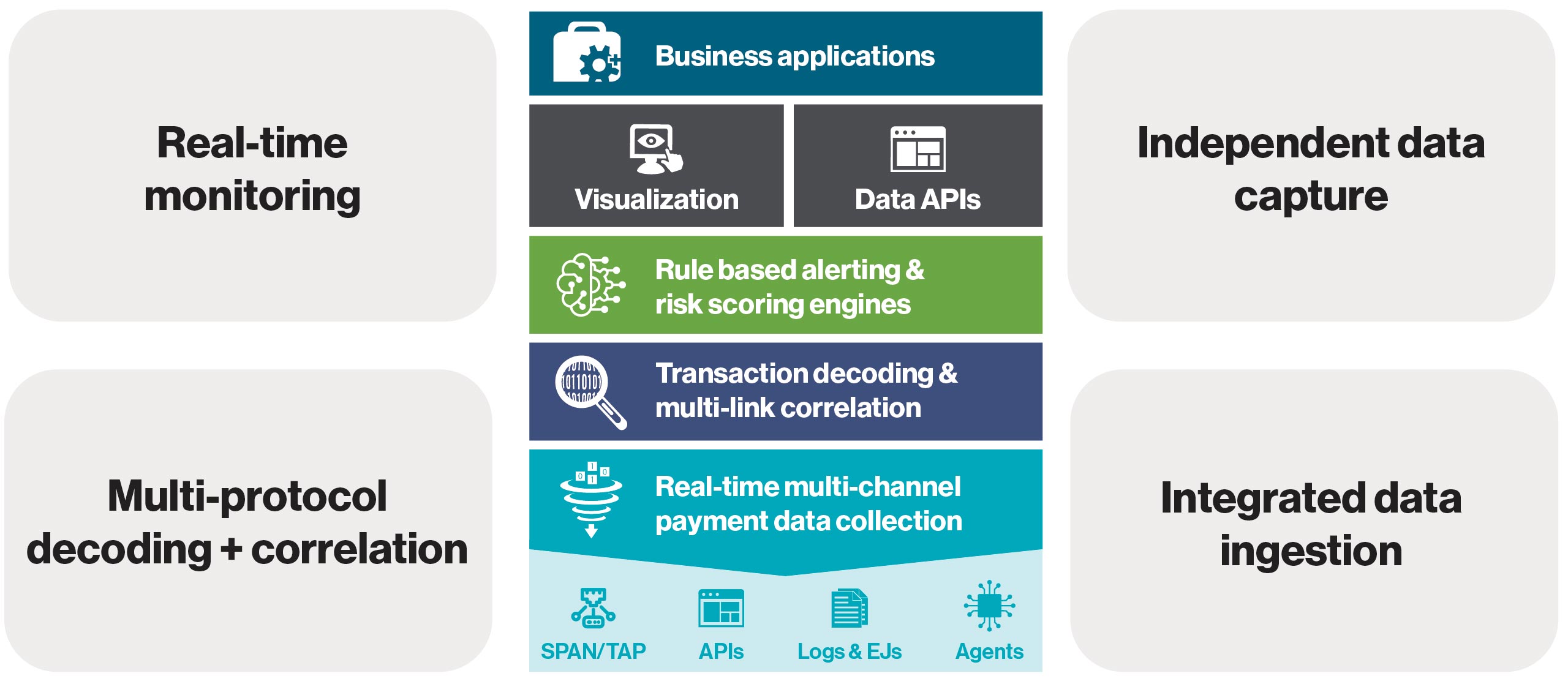 Use network TAP or SPAN ports to passively capture a copy of raw network packets from multiple points across the network, and reassemble them into complete transactions in real-time – with no heavy instrumentation, tagging, extra traffic loads or changes to the payments switch and without sitting in-line or impacting the authorization process